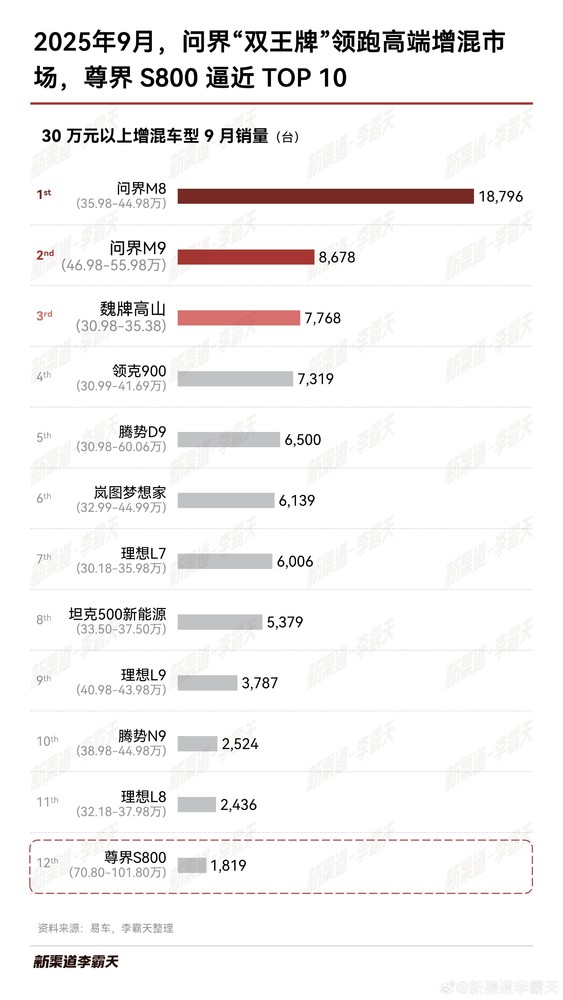 【CNMO科技消息】据最新行业数据,2025年9月30万元以上增混车型销量榜单正式出炉。CNMO注意到配资免费体验,本次榜单共涵盖7个品牌的12款车型,其中问界品牌以两款车型合计超2.7万台的绝对优势领跑市场,理想汽车则凭借三款车型形成集团化突围态势。